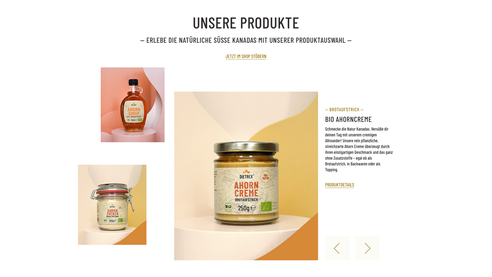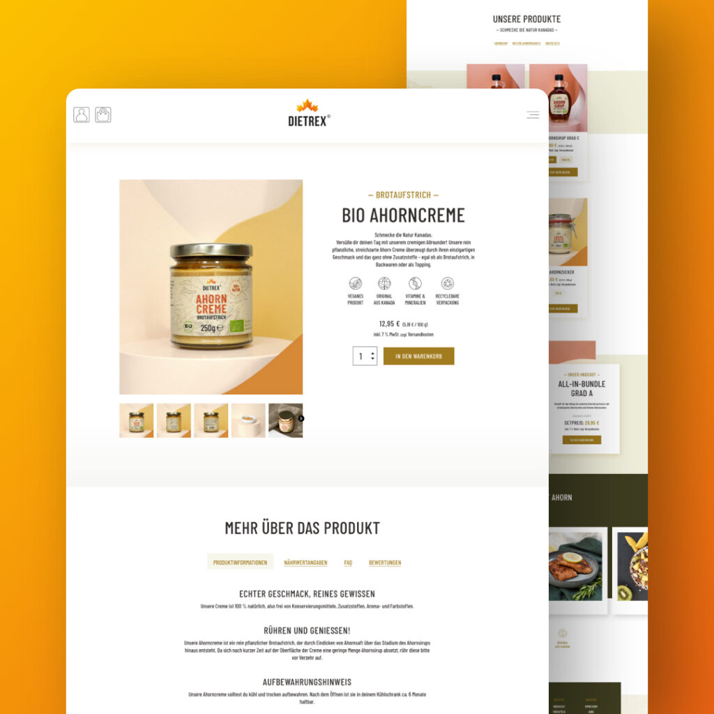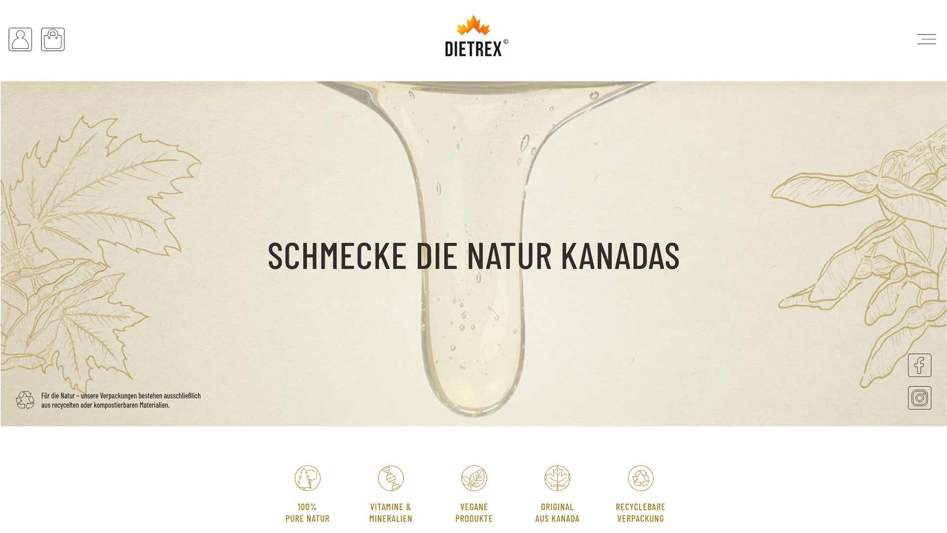 Für den Brand-Relaunch der Marke Dietrex entstanden neben Logo und neuem Packaging auch eine Marketingstrategie sowie eine komplett neu aufgebaute Shopseite. Gemeinsam mit Raffaela Milles und Louisa Schmitz entstand in den Bereichen Packaging, Brand und Webdesign eine neue Markenwelt rund um die leckeren Ahornprodukte des Unternehmens Dietrex.